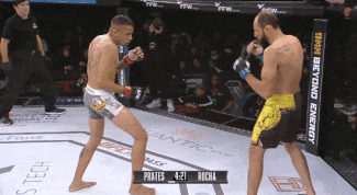 Prates’ other response to the low line side kick was to try to walk through it. In this instance he stays heavy on his lead foot and tries to walk Giles down, but Giles cracks him with another quick punching combination because Prates is fighting so heavy on the front foot.