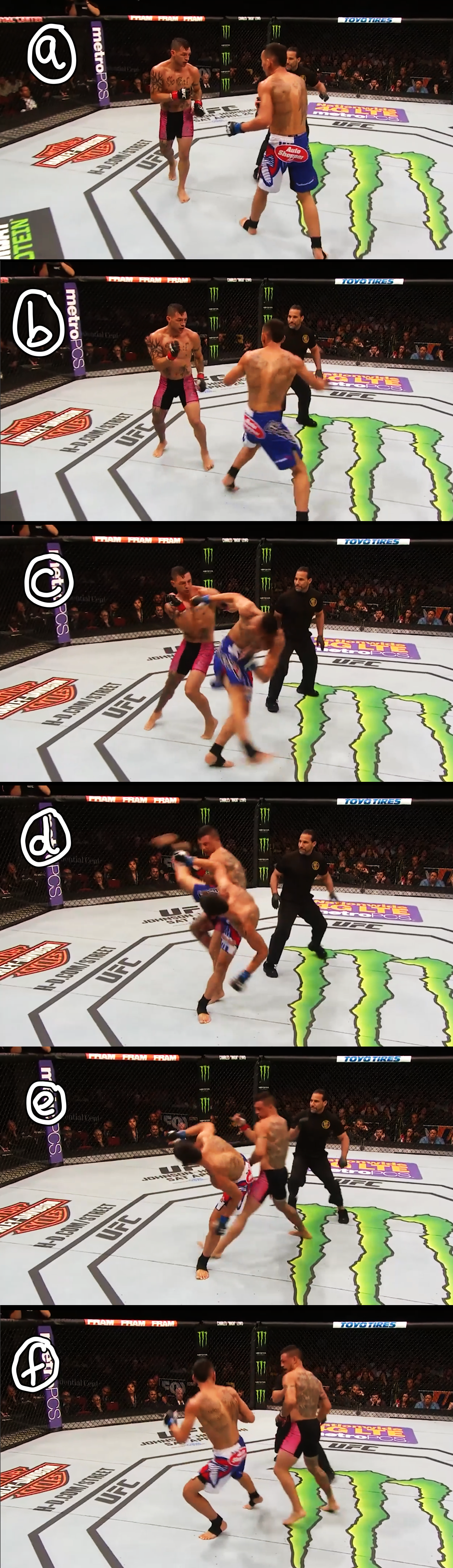 If the opponent has no boundary at his back, retreat is still viable. Figure 4 shows a repeat occurrence from Holloway’s fight with Clay Collard. Holloway obviously telegraphs his back kick with a naked step across himself (b), and as Collard drops back and to the right, Holloway throws himself wildly out of position. This is not disastrous because the opponent has used the space behind him to escape the kick so he is rarely in position to really take advantage before the kicker can get back on guard.