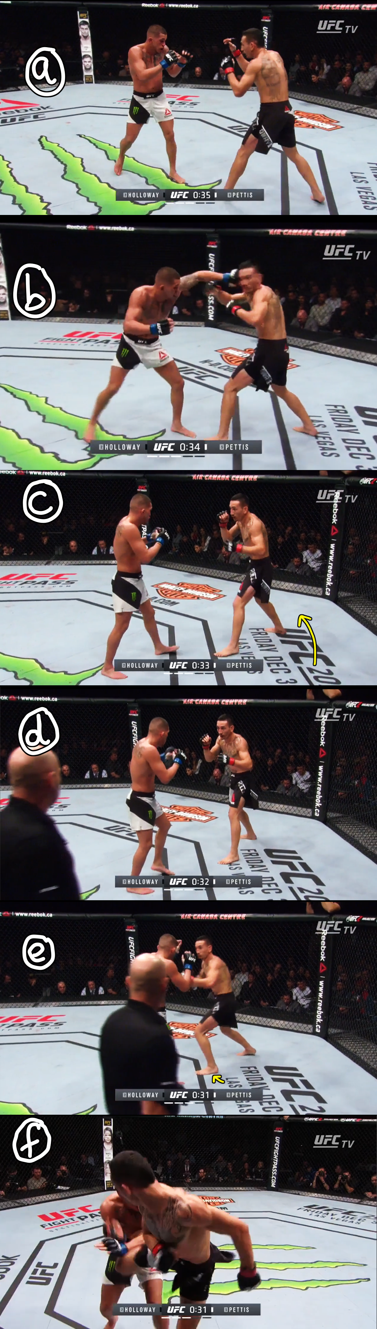 Exiting this exchange, Holloway was able to feign a back kick by stepping his lead foot to the middle and turning his shoulders, and then return with a right straight that stunned Pettis and began a flurry that would result in a TKO.