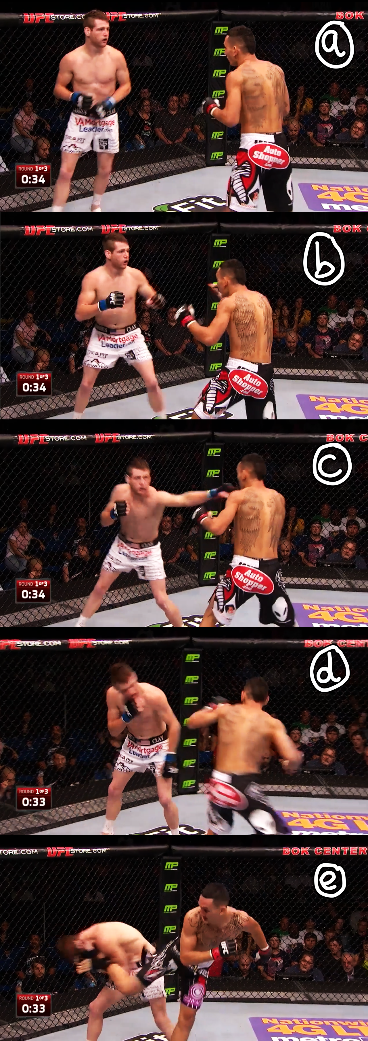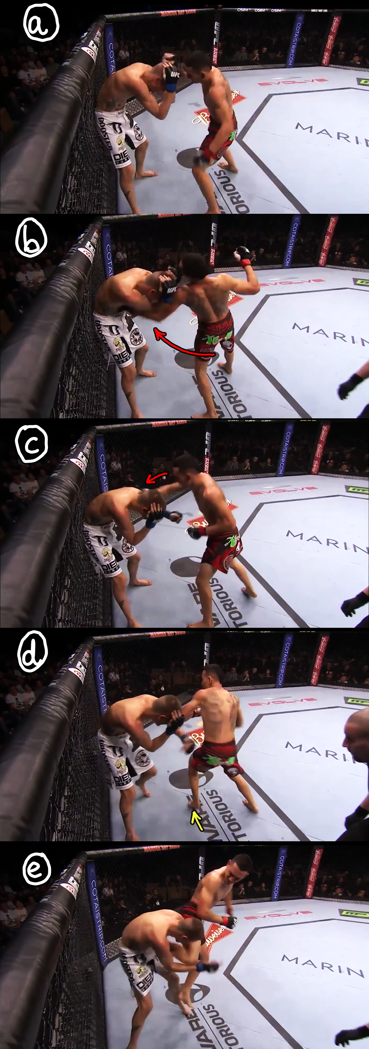 Holloway has found a variety of creative ways to get his feet onto a line in order to spin, and he shows new ones in almost every fight. When combined with moving the opponent to the boundary, these work even better. Figure 10 shows a terrific set up from his fight with Will Chope. A wounded Chope has backed onto the cage (a) and this allows Holloway to get in and rip to the body with his left hook (b). He swats in a right hand to keep Chope busy (c), then steps across himself (d) and performs the short range, jumping back kick that you will often see in the chest-to-chest exchanges of Kyokushin karate (e). With his stance flattened against the fence, and in a full cover up, Chope has no choice but to absorb the brunt of the kick.