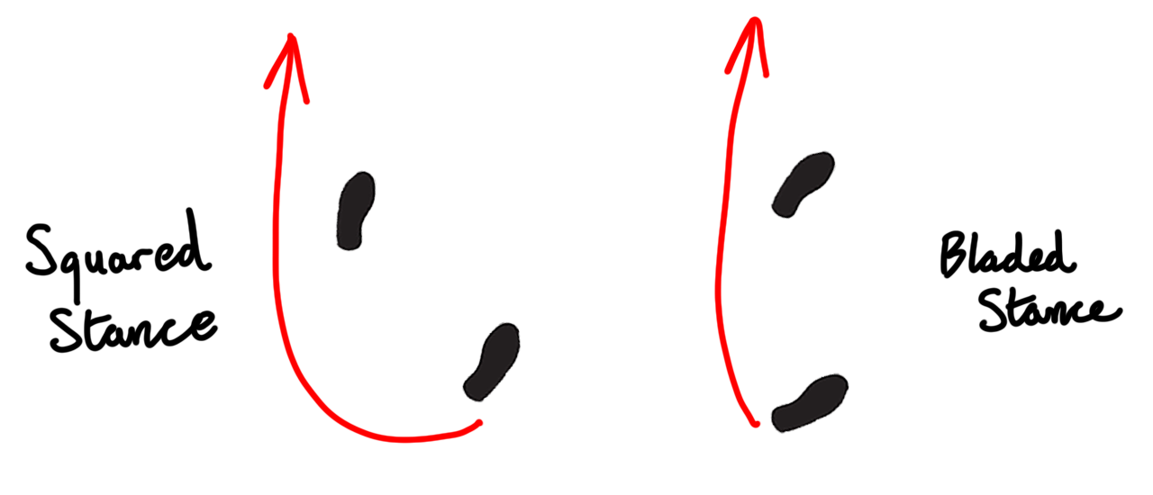 Figure 1 crudely demonstrates the value of getting the feet on a line. When standing in a squared stance, a fighter’s rear foot has to travel a much greater distance to even get in front of the line of his body on the spin. In a bladed stance, the fighter turns on the ball of his lead foot and his kick goes straight across the back of his stance. Throwing a spinning kick from a squared stance necessitates an overspin to hit the target if he is standing at twelve o’clock, and overspin results in loss of power and balance.
