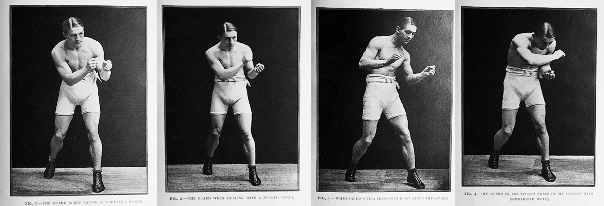 In the course of a brief chapter on the stance, Carpentier describes a stance for use against a scientific boxer, a rugger fighter, a right hand heavy fighter, and the folding guard he used for closing on Bombardier Billy Wells.