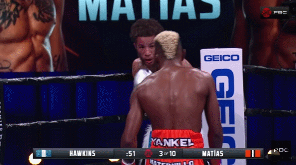 When Hawkins tried to tie up, Matias used his head to post and create space to free his arms and continue punching.